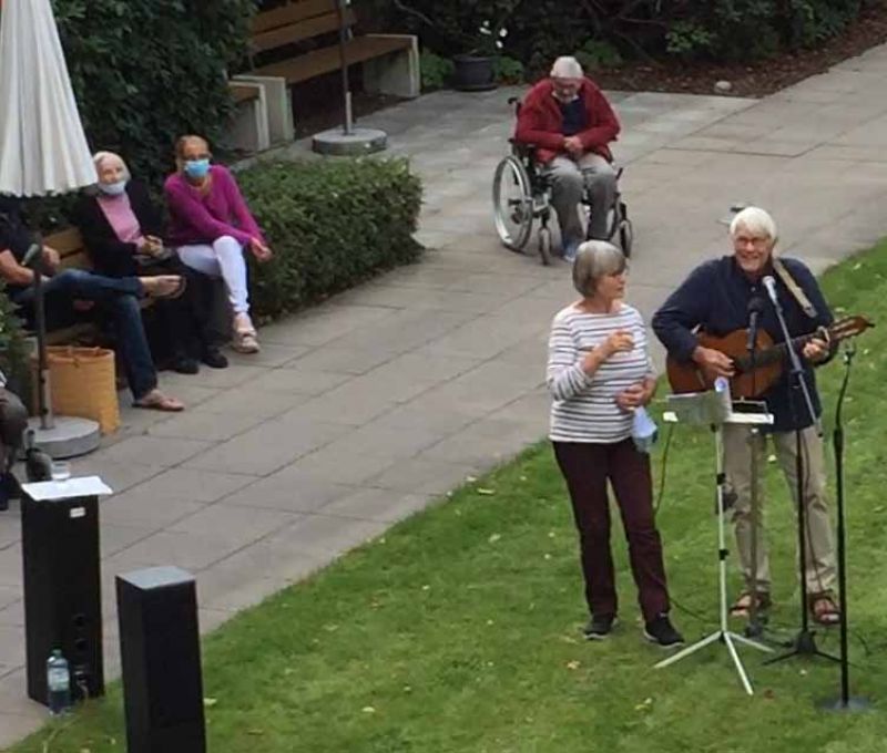 Für Sonntag, den 13. September 2020, hatte der Freundeskreis Julia Wetzel-Kagelmann und Hilke Billerbeck zum Hofkonzert eingeladen. Die beiden Künstler waren zum zweiten Mal gekommen und haben wunderbare Melodien aus Irland und Südamerika gespielt. Zwischendurch spielten die beiden für die Geburtstagskinder ein Ständchen. Bei den bekannten österreichischen Walzerklängen haben die Bewohner*innen leise mitgesungen. Es war ein sonniger unterhaltsamer Nachmittag.