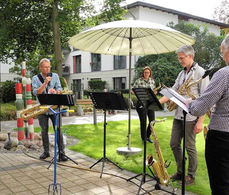 Am 6. September 2020, dem ersten Hofkonzert am Sonntagnachmittag, war das Saxophon-Quartett "Windstärke Sax" erneut zu Gast im Stift. Helle Weidtmann-Leber übernahm den Part von Ulrich Piper. Trotz dunklerWolken und ein paar Regentropfen war es ein wunderbares Klangerlebnis.