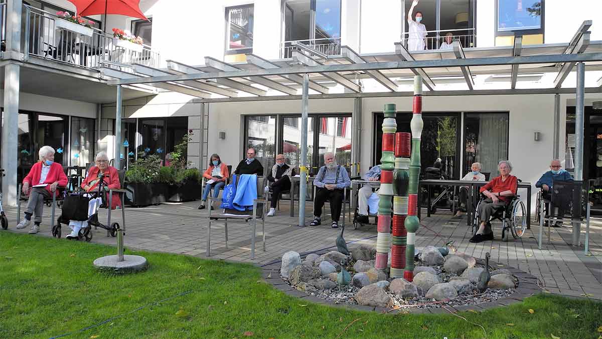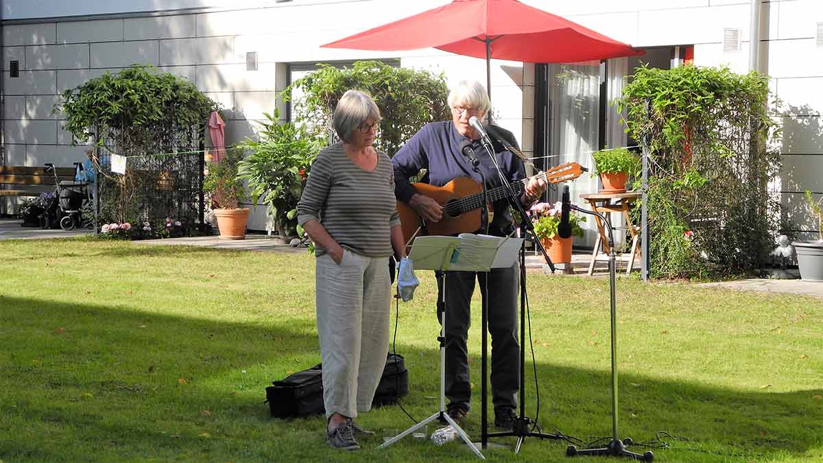 Eine fröhliche Musikstunde! Bei wunderschönem Wetter wurde im Schilling-Stift mit entsprechendem Abstand wieder fleißig gesungen. Diesmal hatten Sabine und Dirk Mötting viele bekannte Seemannslieder mitgebracht. Es war ein gelungener Nachmittag. Tschüss bis zum nächsten Mal.