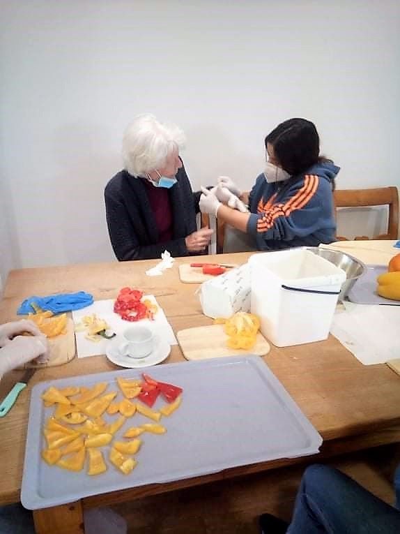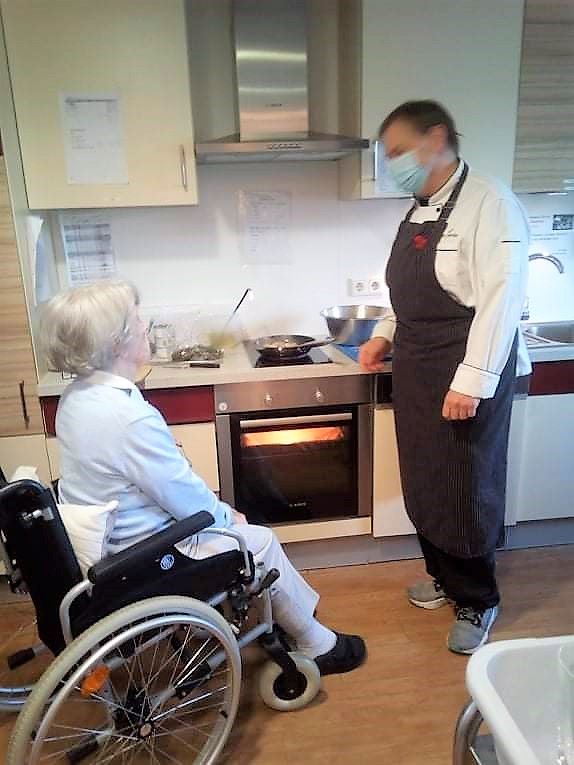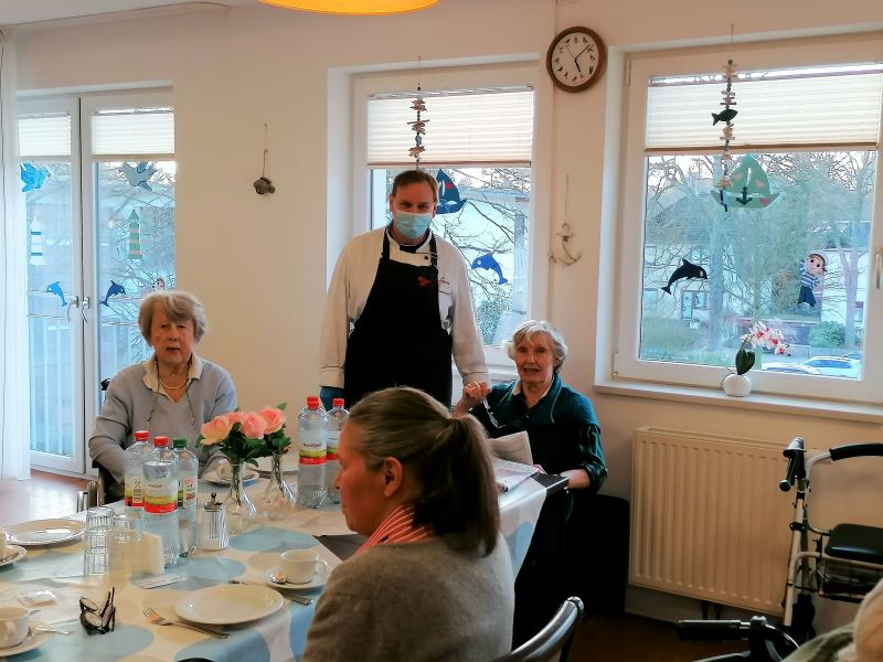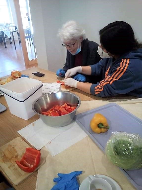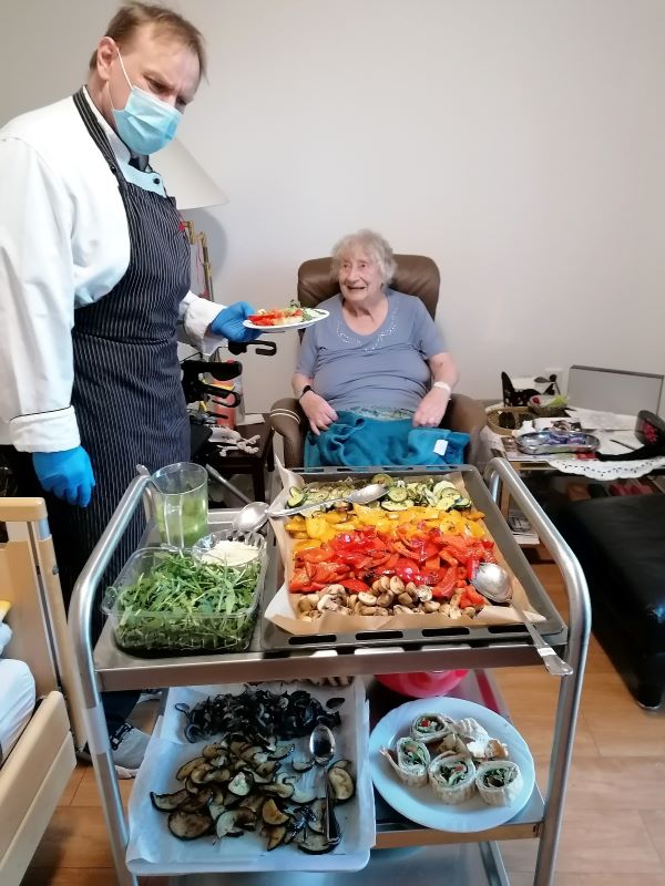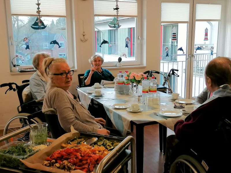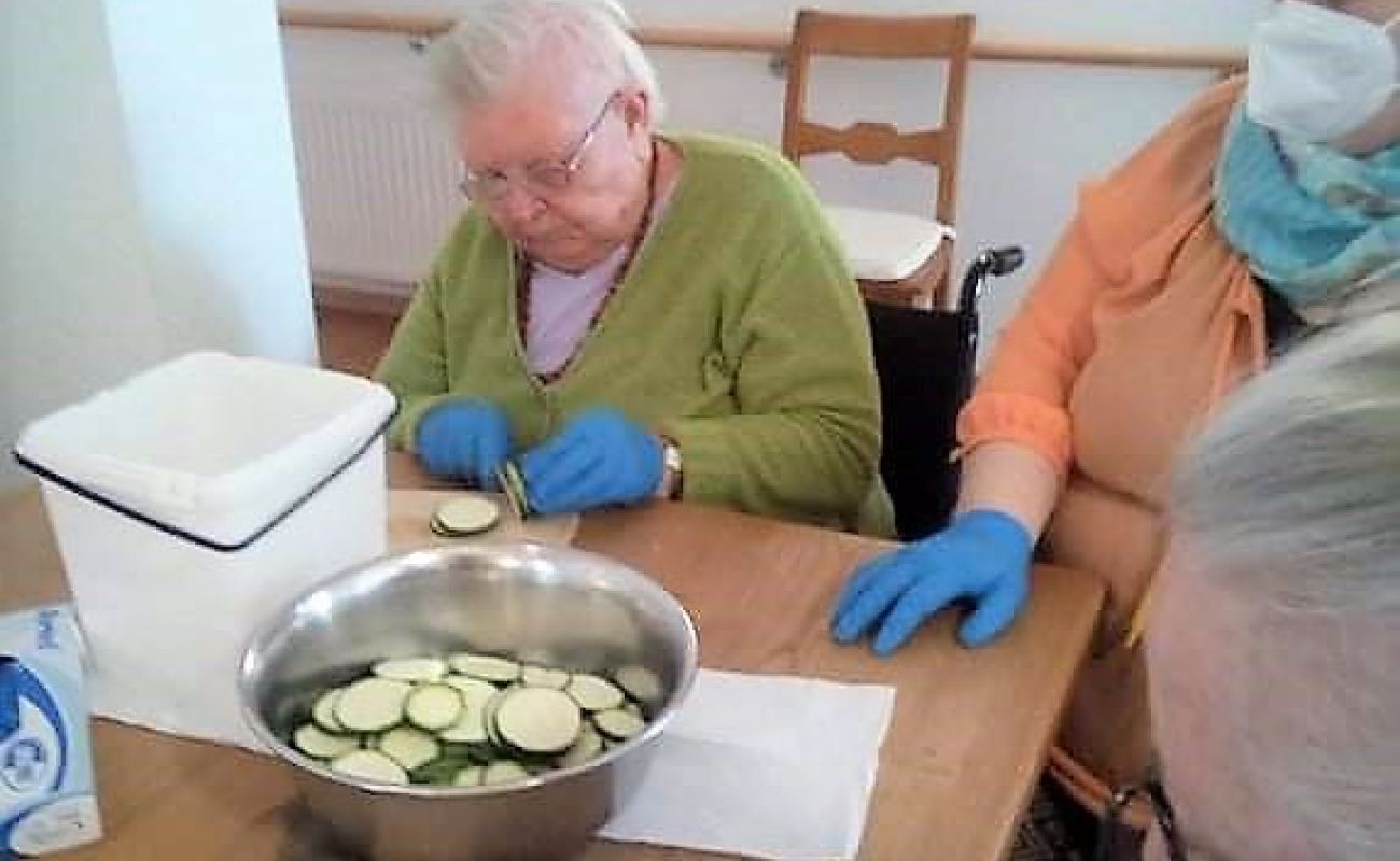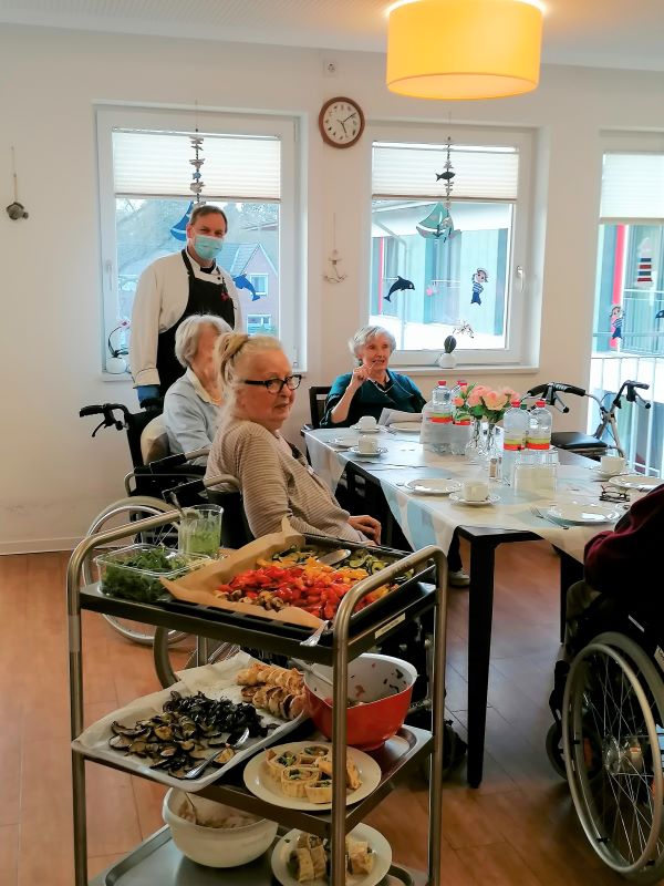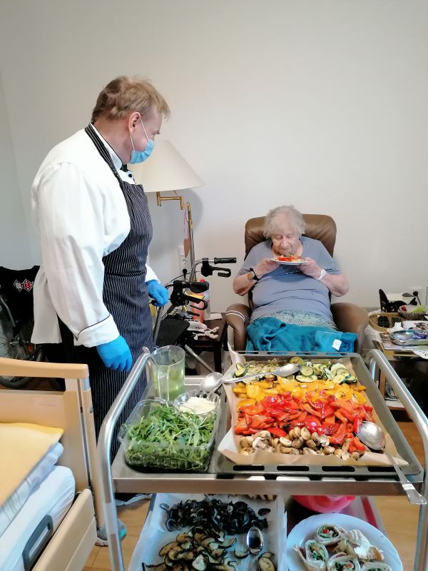 Mit großem Eifer und konzentriert schnippelten die Bewohnerinnen und Bewohner der Wohngruppe Elbe Paprika, Zucchini, Auberginen und viele weitere gesunde Zutaten für die Antipasti, die Eventkoch Oliver Hanke dann vor ihren Augen daraus zauberte. Der appetitanregende Geruch durchzog den ganzen Wohnbereich - und alle genossen anschließend die leckeren Antipasti!