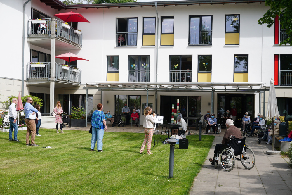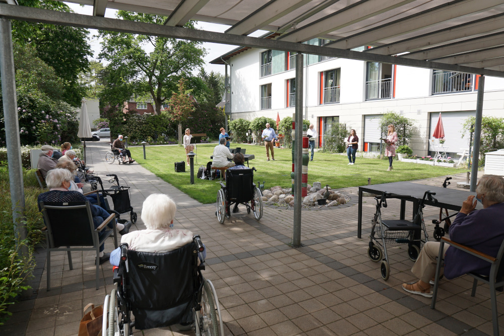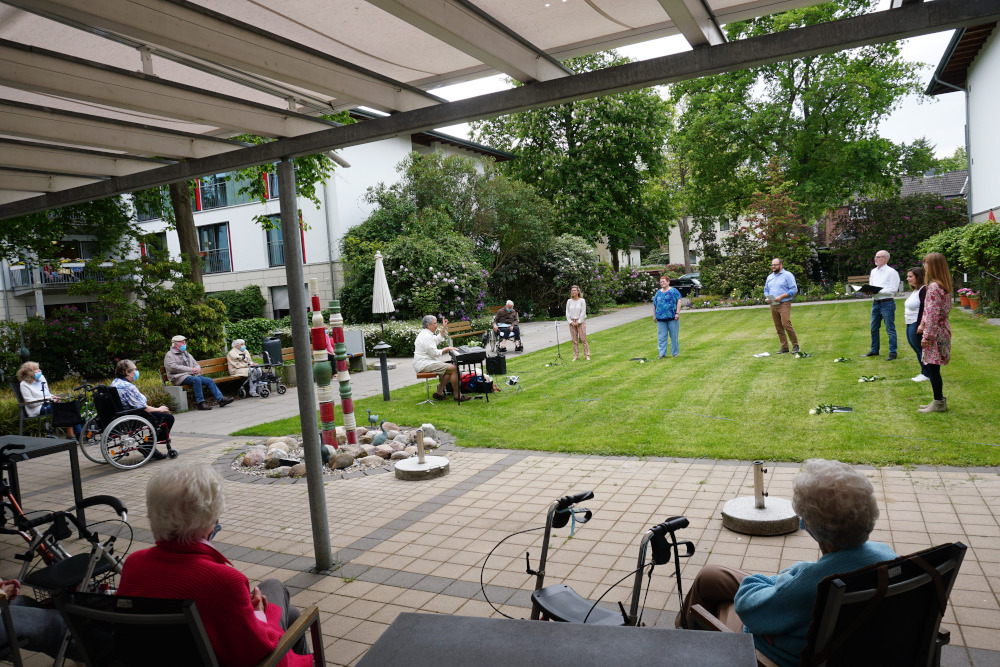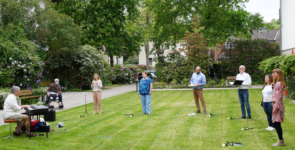 Mitglieder des Gospelchores Blankenese waren am Mittwoch, 27. Mai 2020 im Stift zu Gast. Schönes Wetter - und viele Bewohner haben sich draußen vor den SängerInnen eingefunden. Sie sind begeistert. Und der Chor wird am Ende geradezu genötigt, noch eine Zugabe den Hörern vor dem Haus, auf den Balkonen und an den geöffneten Fenstern zu schenken.
