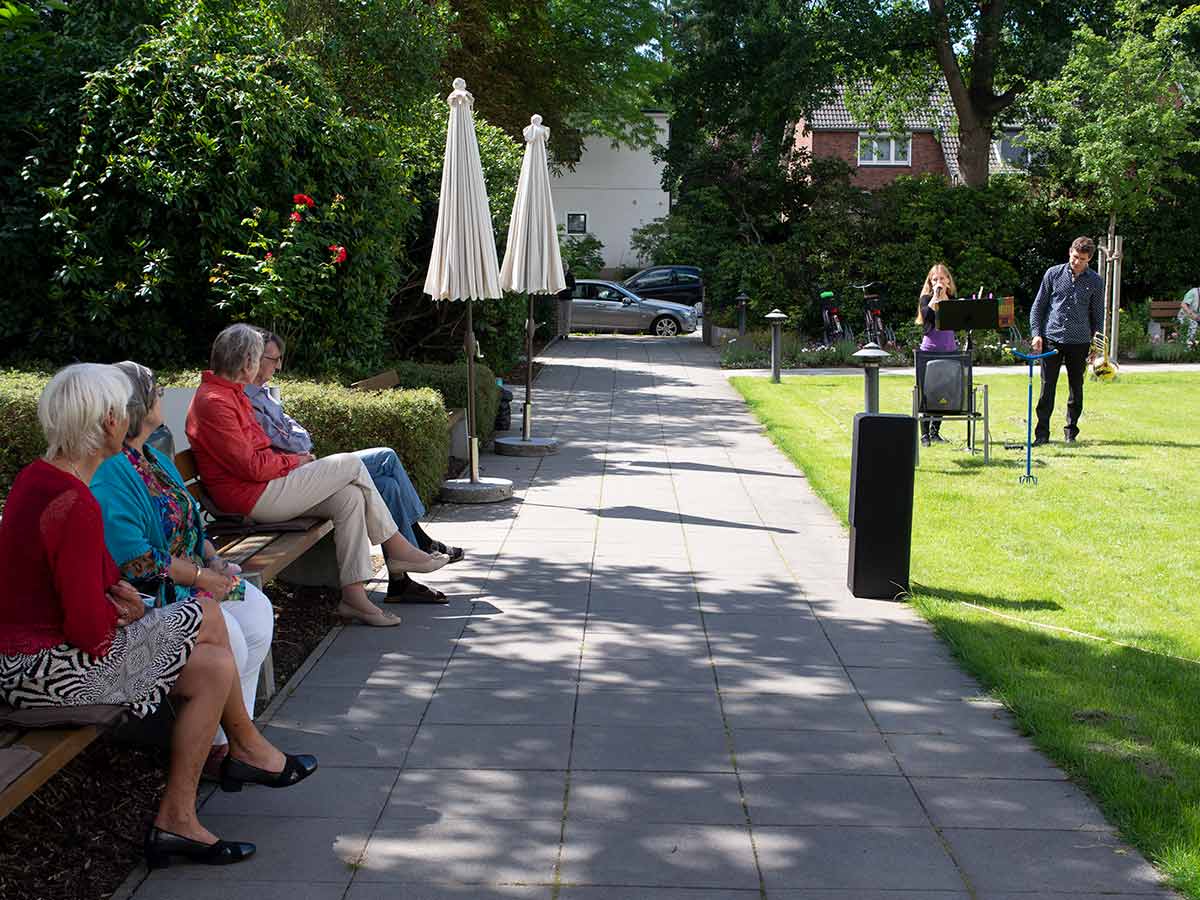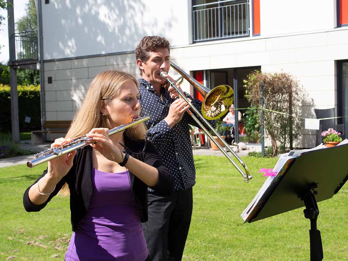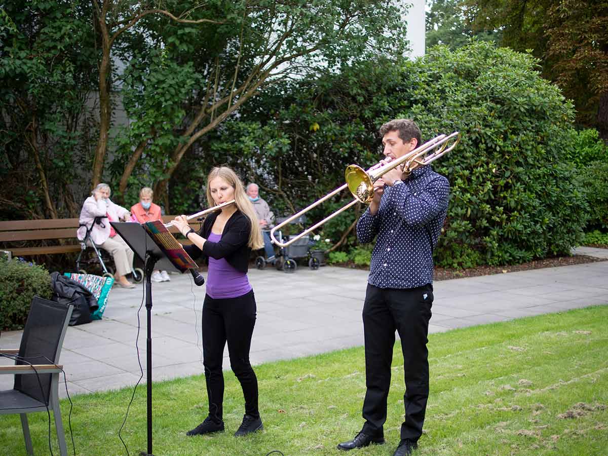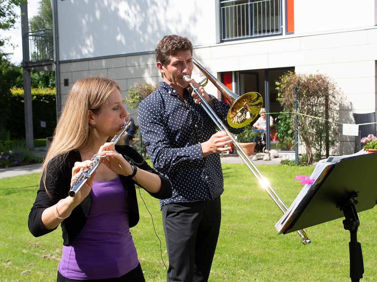 Das heutige Gartenkonzert bestritt das zauberhafte Duo Anja Kreuzer (Querflöte) und Andrii Shparkyi (Posaune). Nachdem Frau Drews vom Freundeskreis Schillingstift e.V. die beiden Musiker willkommen geheißen hatte, wurden die Wolken vom Klang der Musik vertrieben. Die ursprünglich für Querflöte und Bass geschriebenen Stücke haben auch in dieser ungewöhnlichen Kombination zweier Blasinstrumente sehr überzeugt!