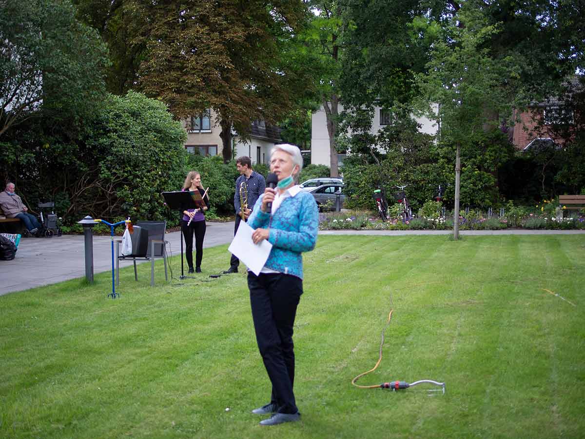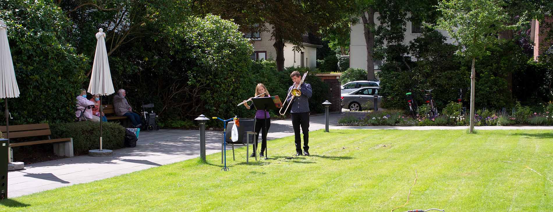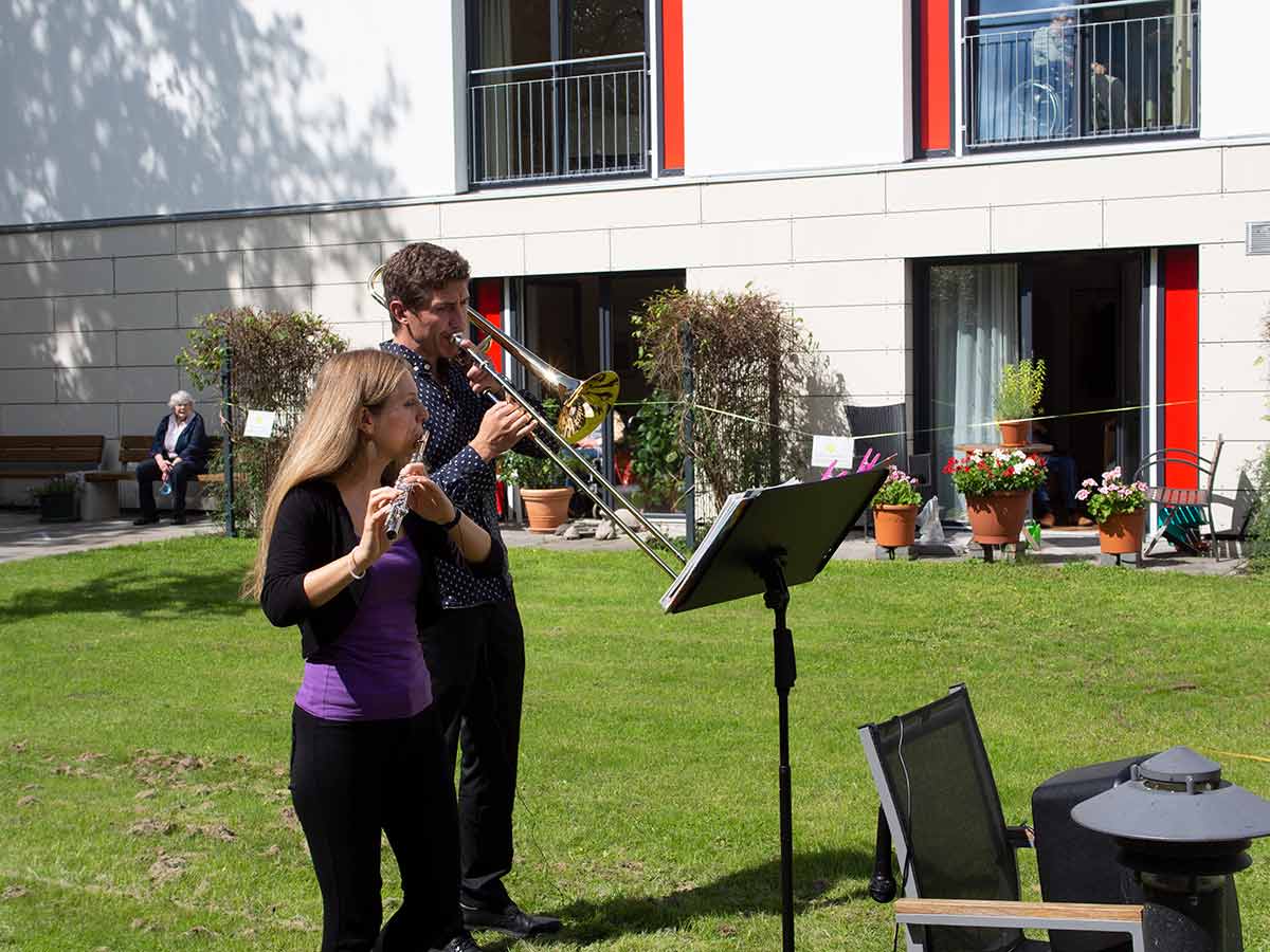 Das heutige Gartenkonzert bestritt das zauberhafte Duo Anja Kreuzer (Querflöte) und Andrii Shparkyi (Posaune). Nachdem Frau Drews vom Freundeskreis Schillingstift e.V. die beiden Musiker willkommen geheißen hatte, wurden die Wolken vom Klang der Musik vertrieben. Die ursprünglich für Querflöte und Bass geschriebenen Stücke haben auch in dieser ungewöhnlichen Kombination zweier Blasinstrumente sehr überzeugt!