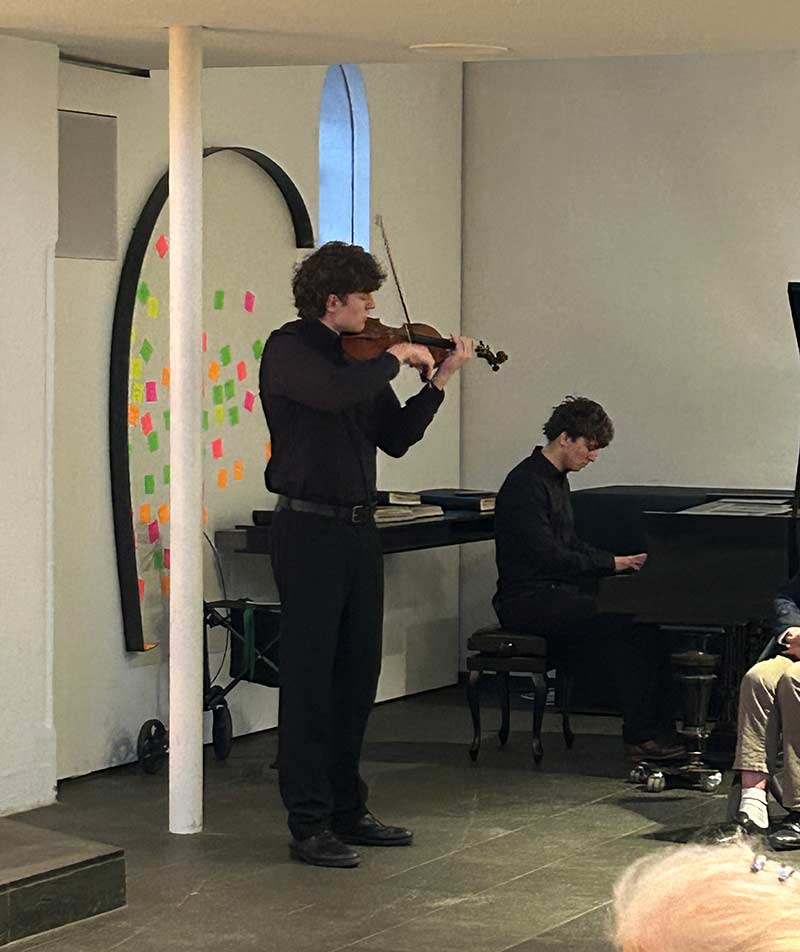 Musikalisch wurde der Gottesdienst wieder begleitet von den Brüdern Jan und Lukas Westphal an Violine, Flügel und Orgel. Außer der Begleitung der von allen mitgesungenen Lieder waren besonders die wunderschönen Stücke von J.S. Bach und Niccolo Paganini wieder Höhepunkte der Gedenkfeier.