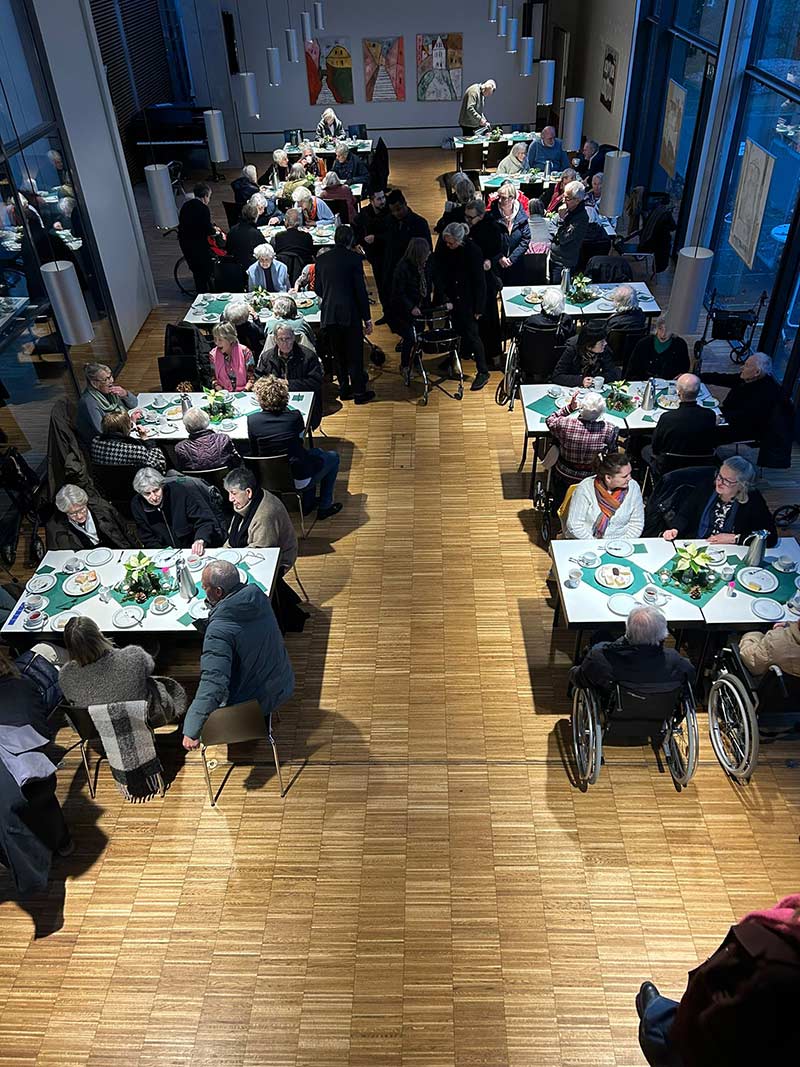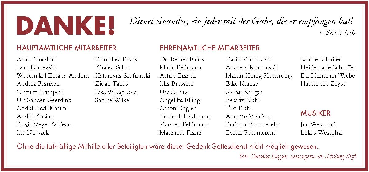 So viele Mitarbeitende wie nie zuvor hatten sich zur Teilnahme und Mithilfe zu diesem besonderen Gottesdienst bereit erklärt. Und auch aus unserem großen Kreis ehrenamtlicher Unterstützer beteiligten sich viele helfende Hände, Mitglieder der Gottesdienst-Gruppe bei der Durchführung der Gedenkfeier selbst, unserem Haus verbundene Gemeindemitglieder mit dem Küsterdienst, Mitglieder des Vorstands und dem Bewohnerbeirat bei der Vorbereitung und Ausrichtung des anschließenden gemütlichen Miteinanders im Gemeindehaus – um nur einige zu nennen.