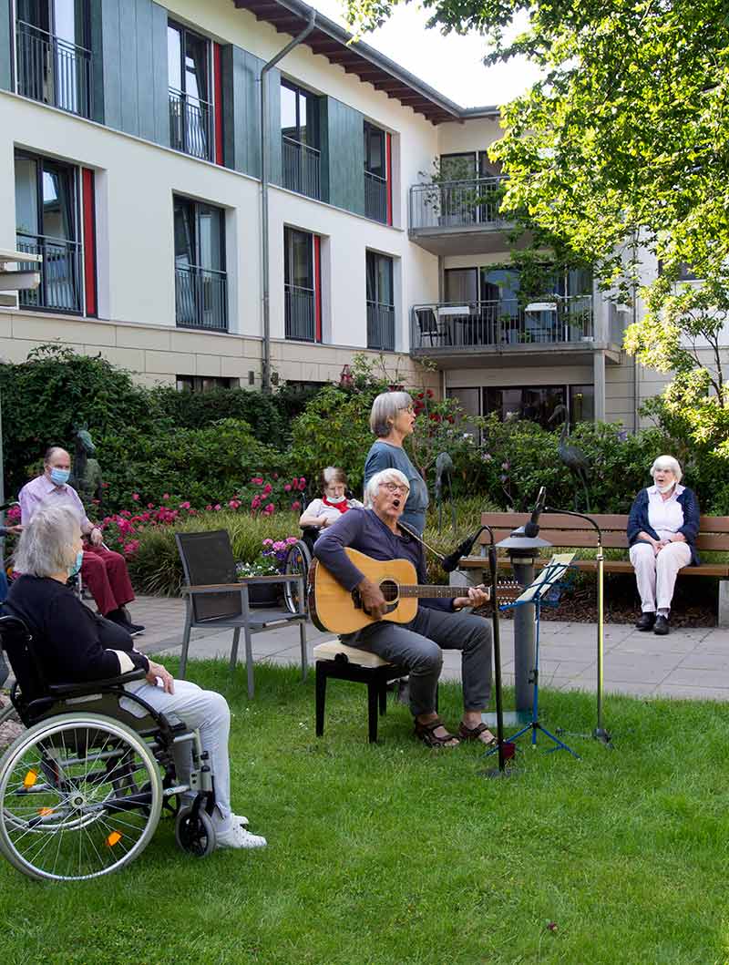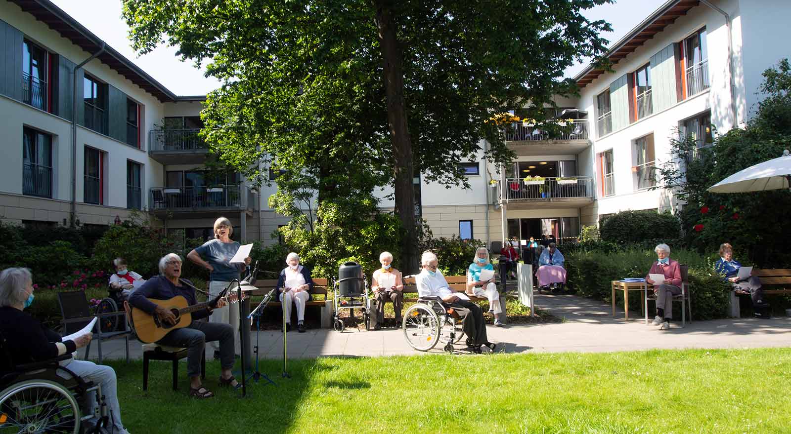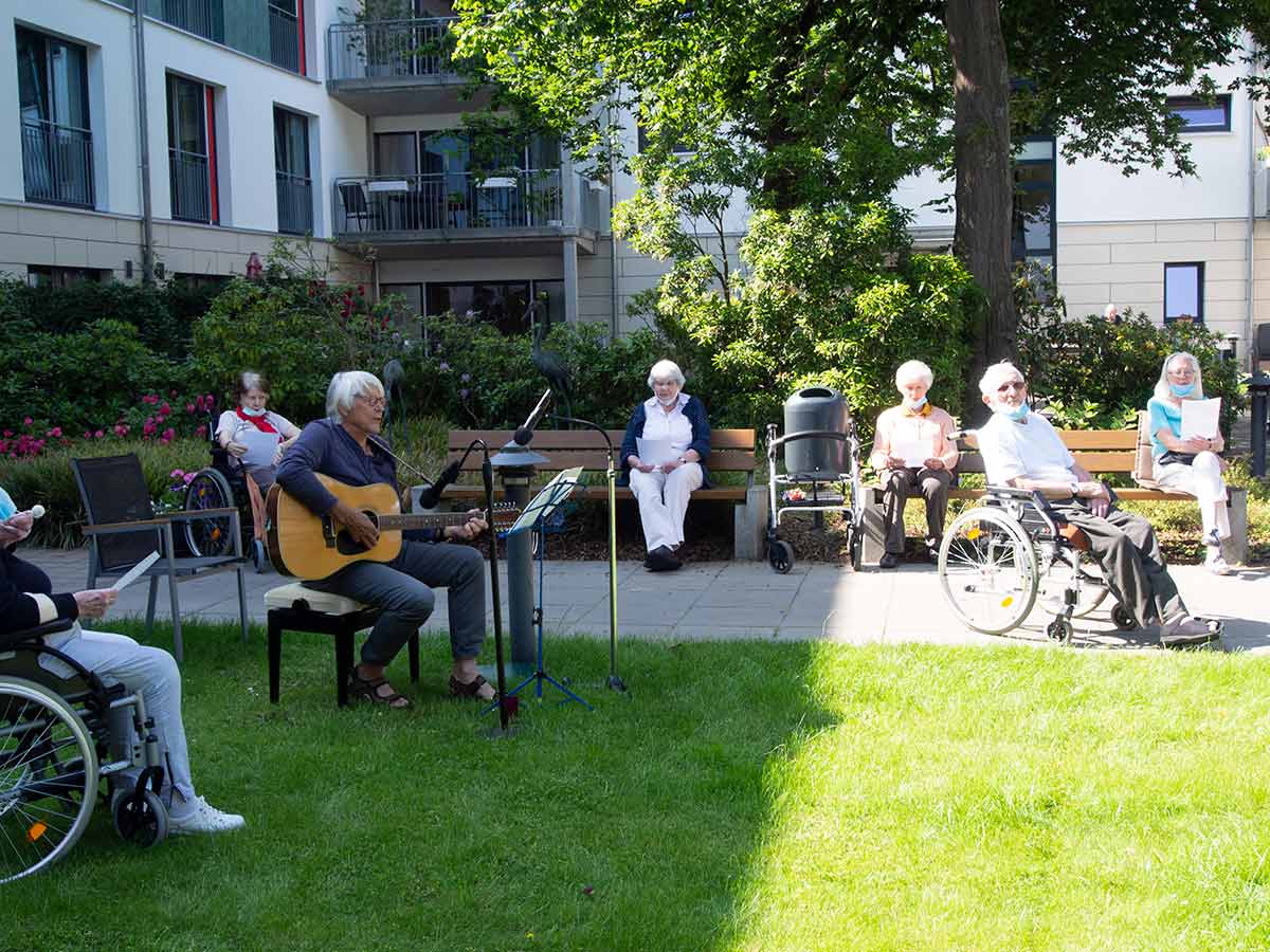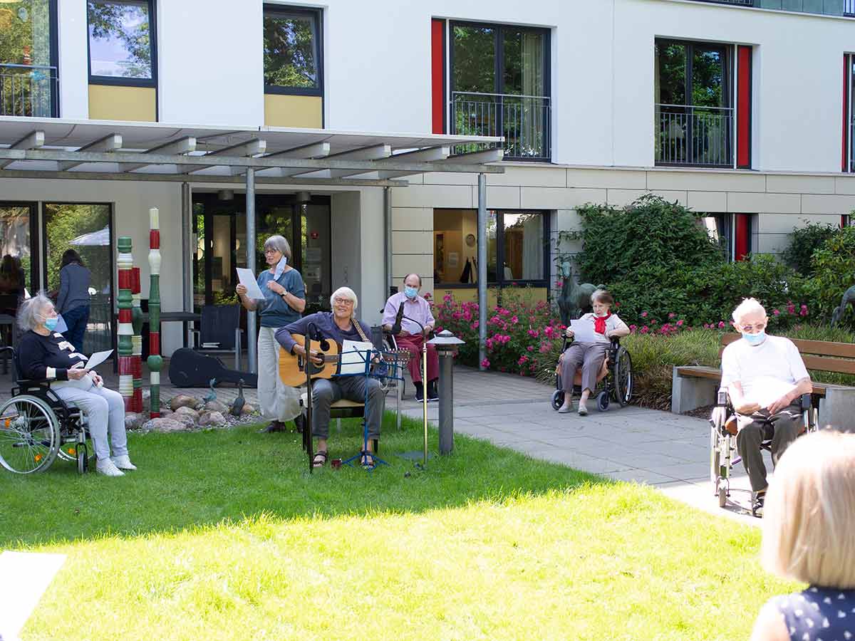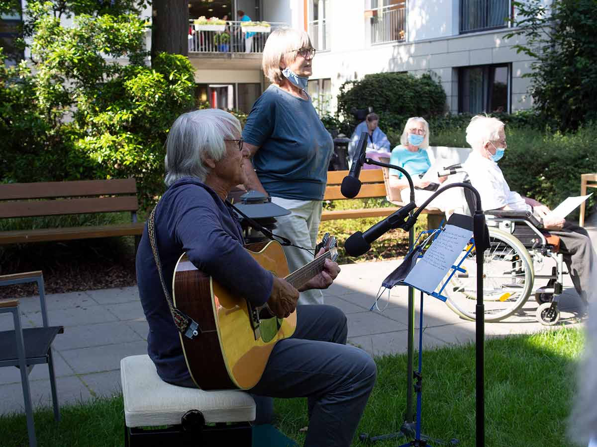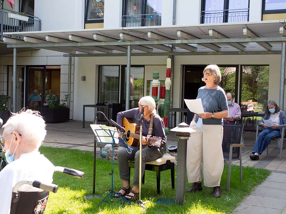 Lange mussten wir sie missen - Sabine Mötting, ihr Mann Dirk und seine Gitarre kamen vor Corona wöchentlich in die 1. Etage, um gemeinsam mit Mitarbeitern und den Bewohnern des Schilling-Stifts zu singen. Altbekannte Hamburger Lieder, mit frecher Zunge schwungvoll angestimmt. - heute endlich gab es ein Wiedersehen und eine große Gesangsrunde im Innenhof bei prallem Sonnenschein. Schön, dass Sie da waren, liebes Ehepaar Mötting!