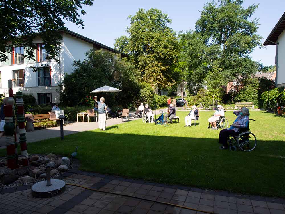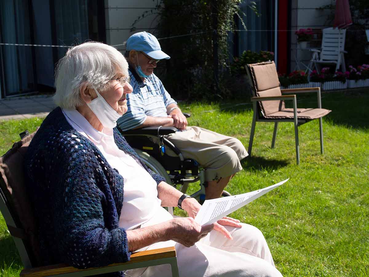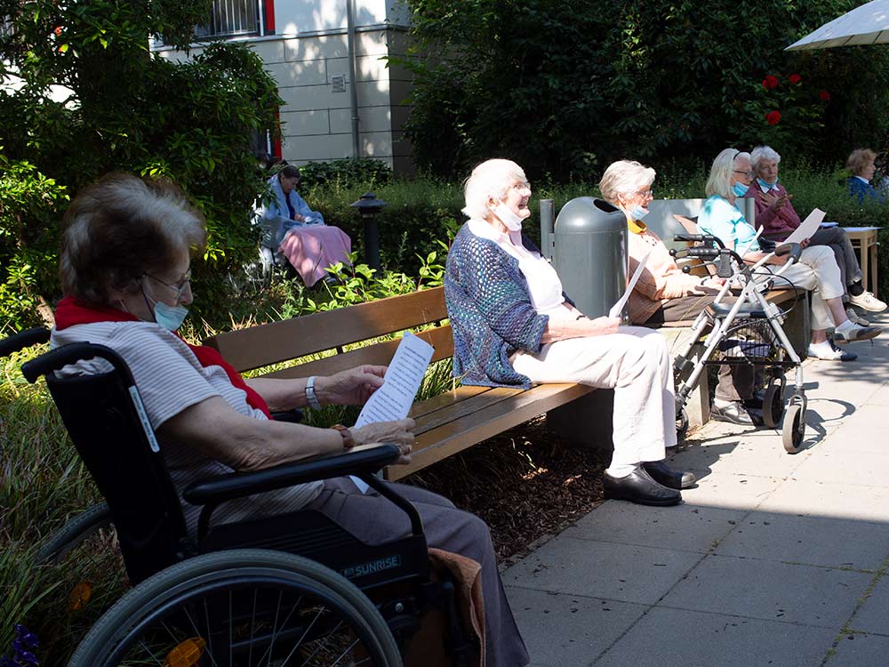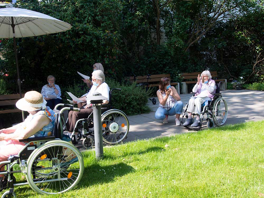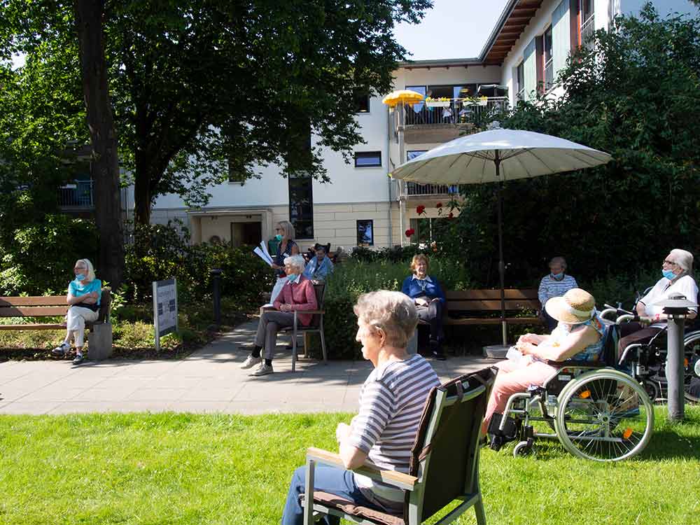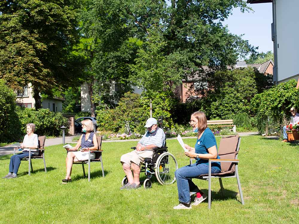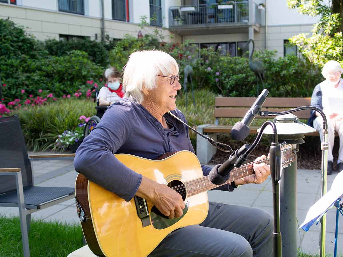 Lange mussten wir sie missen - Sabine Mötting, ihr Mann Dirk und seine Gitarre kamen vor Corona wöchentlich in die 1. Etage, um gemeinsam mit Mitarbeitern und den Bewohnern des Schilling-Stifts zu singen. Altbekannte Hamburger Lieder, mit frecher Zunge schwungvoll angestimmt. - heute endlich gab es ein Wiedersehen und eine große Gesangsrunde im Innenhof bei prallem Sonnenschein. Schön, dass Sie da waren, liebes Ehepaar Mötting!