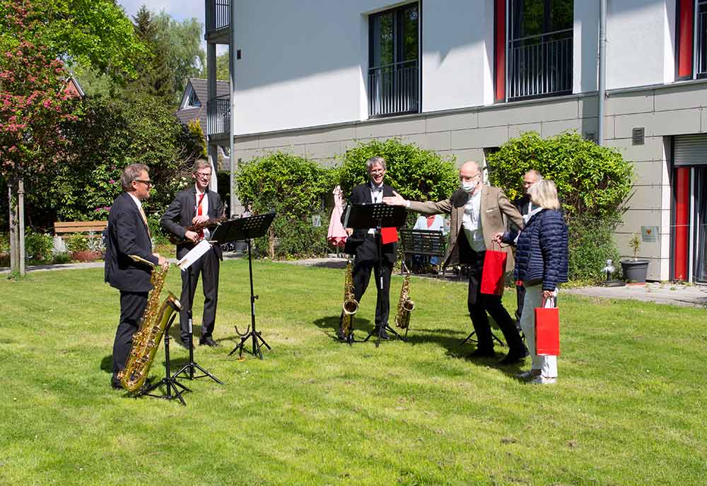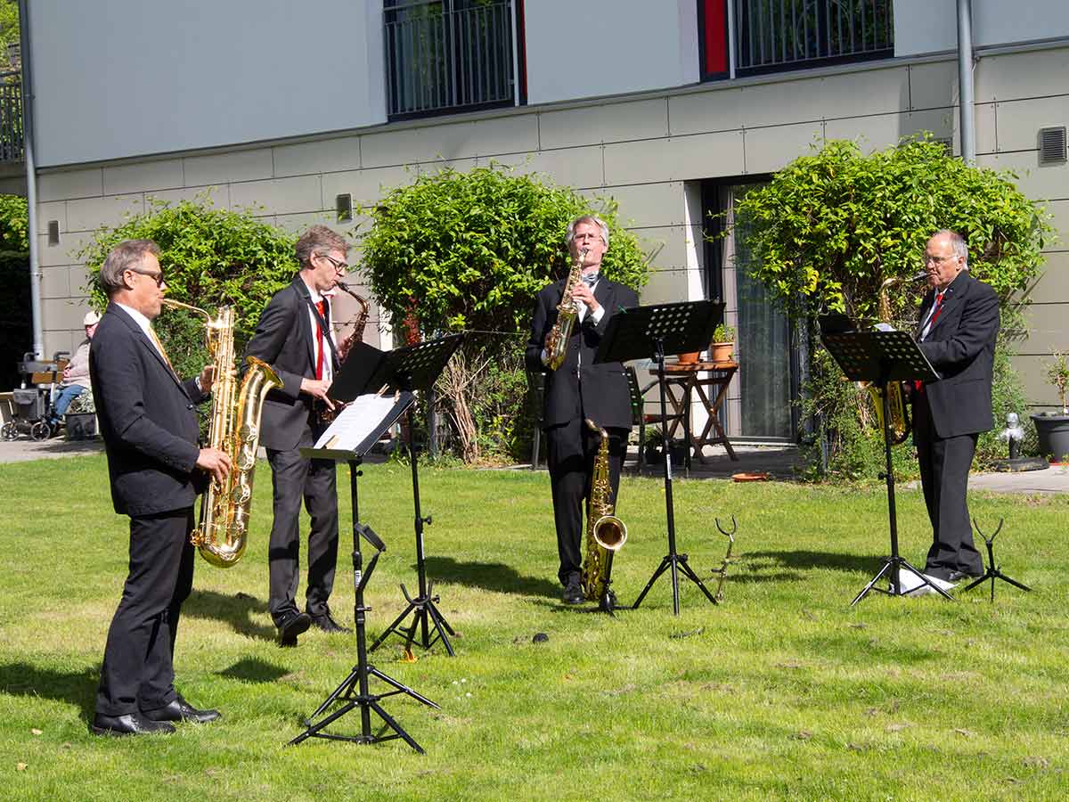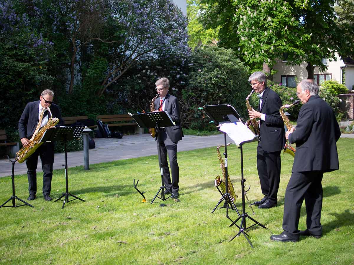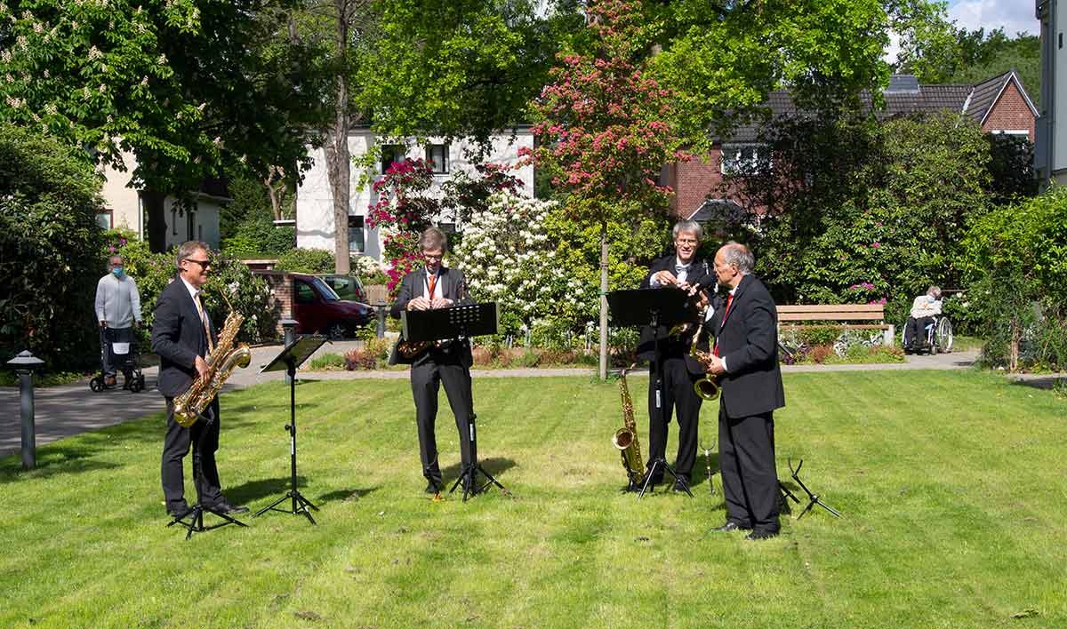 Sonntags hielten wir sonst immer Gottesdienst in der Lounge. Dann kam Corona. Gemeinsame Veranstaltungen - welcher Art auch immer - duften nicht mehr sein. Im Haus. Aber draußen? Draußen - unter freiem Himmel. Erst 4 Akteure, jetzt dürfen 6. Wir hätten schon lange auch draußen Gottesdienste feiern können. An Pfingsten wollen wir das endlich wieder tun. Die Musik hat zuerst den freien Himmel erkannt und „Gott sei Dank“ genutzt. Heute, am 17. Mai, Gartenkonzert am Sonntag um 10 Uhr. Zu Gast vor dem Stift: Das Saxophon-Quartett “Windstärke Sax“ mit Klaus Hochreiter (Tenor), Jochen Kömpe (Alt & Tenor), Ulrich Piper (Alt), Christof Siemes (Bariton). Sie spielen für uns Klassik, Tango, Jazz, Schlager und Pop.