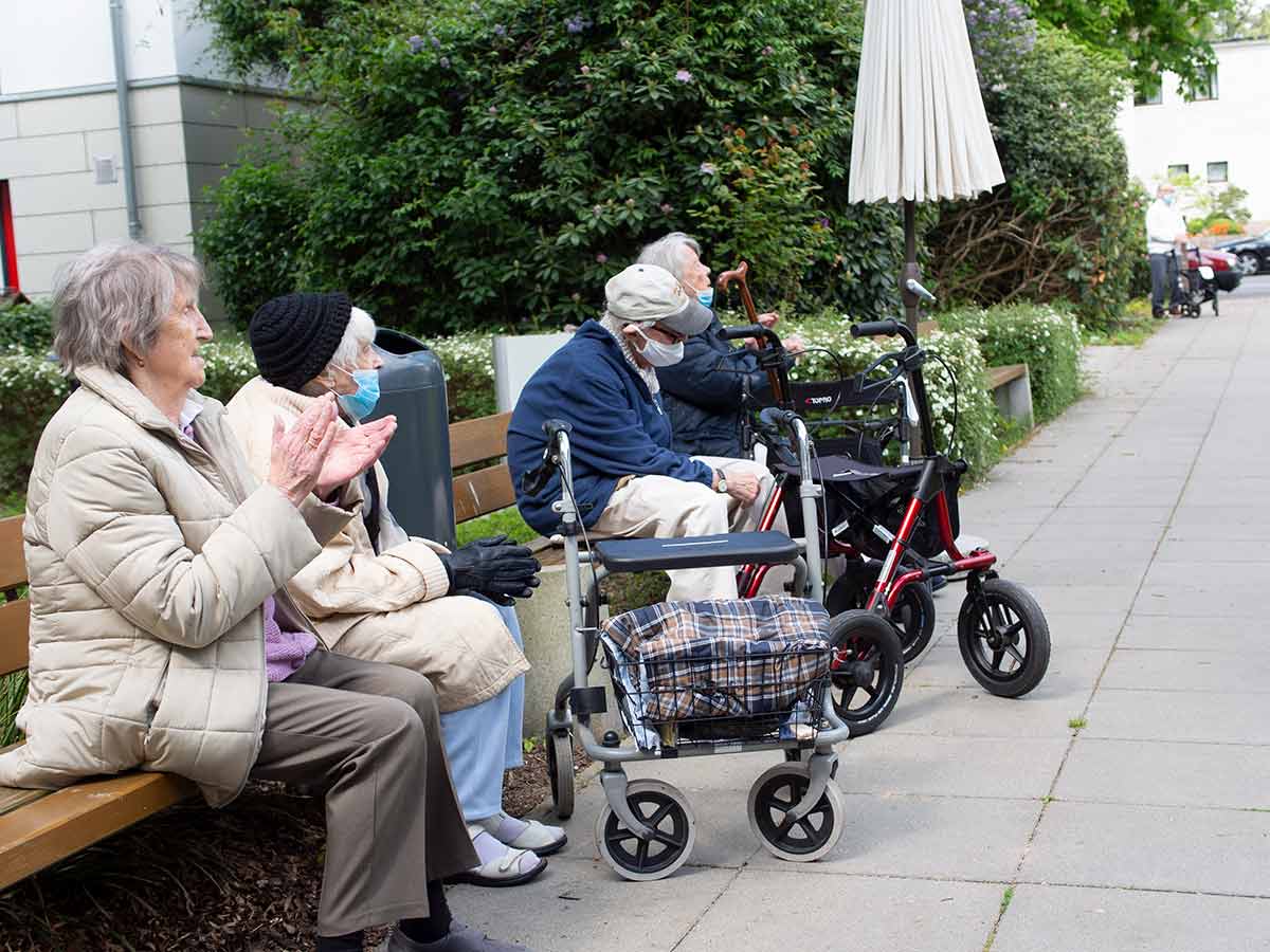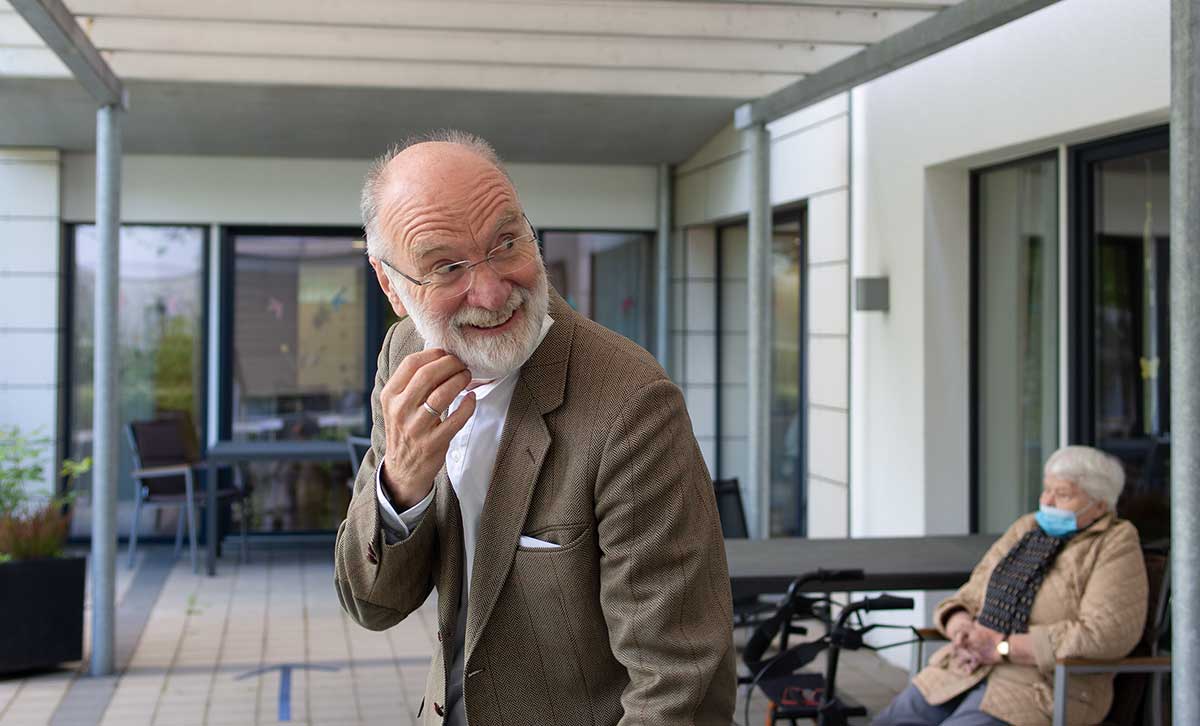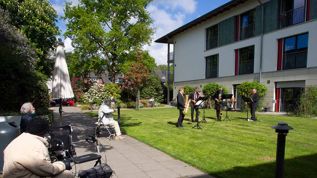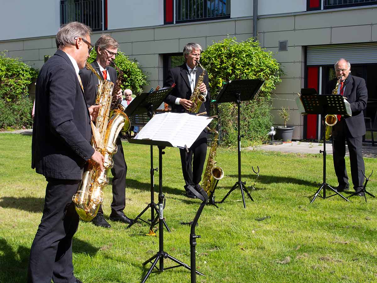 Sonntags hielten wir sonst immer Gottesdienst in der Lounge. Dann kam Corona. Gemeinsame Veranstaltungen - welcher Art auch immer - duften nicht mehr sein. Im Haus. Aber draußen? Draußen - unter freiem Himmel. Erst 4 Akteure, jetzt dürfen 6. Wir hätten schon lange auch draußen Gottesdienste feiern können. An Pfingsten wollen wir das endlich wieder tun. Die Musik hat zuerst den freien Himmel erkannt und „Gott sei Dank“ genutzt. Heute, am 17. Mai, Gartenkonzert am Sonntag um 10 Uhr. Zu Gast vor dem Stift: Das Saxophon-Quartett “Windstärke Sax“ mit Klaus Hochreiter (Tenor), Jochen Kömpe (Alt & Tenor), Ulrich Piper (Alt), Christof Siemes (Bariton). Sie spielen für uns Klassik, Tango, Jazz, Schlager und Pop.