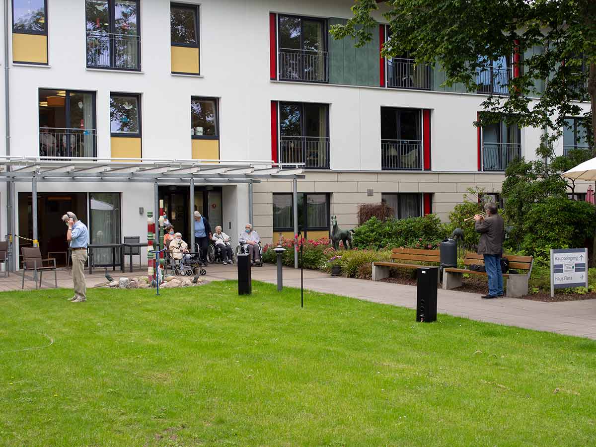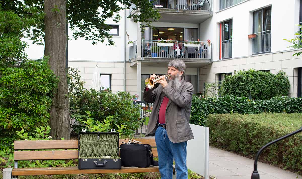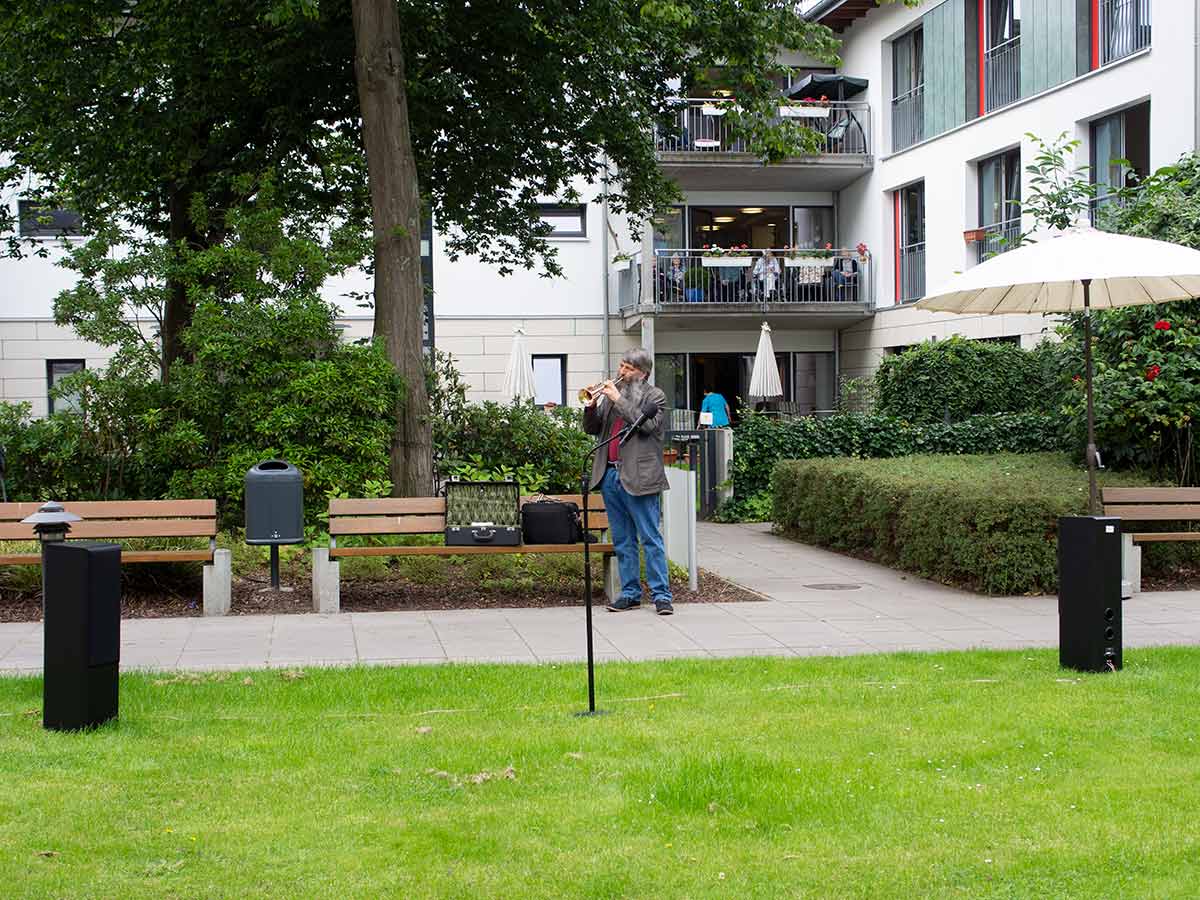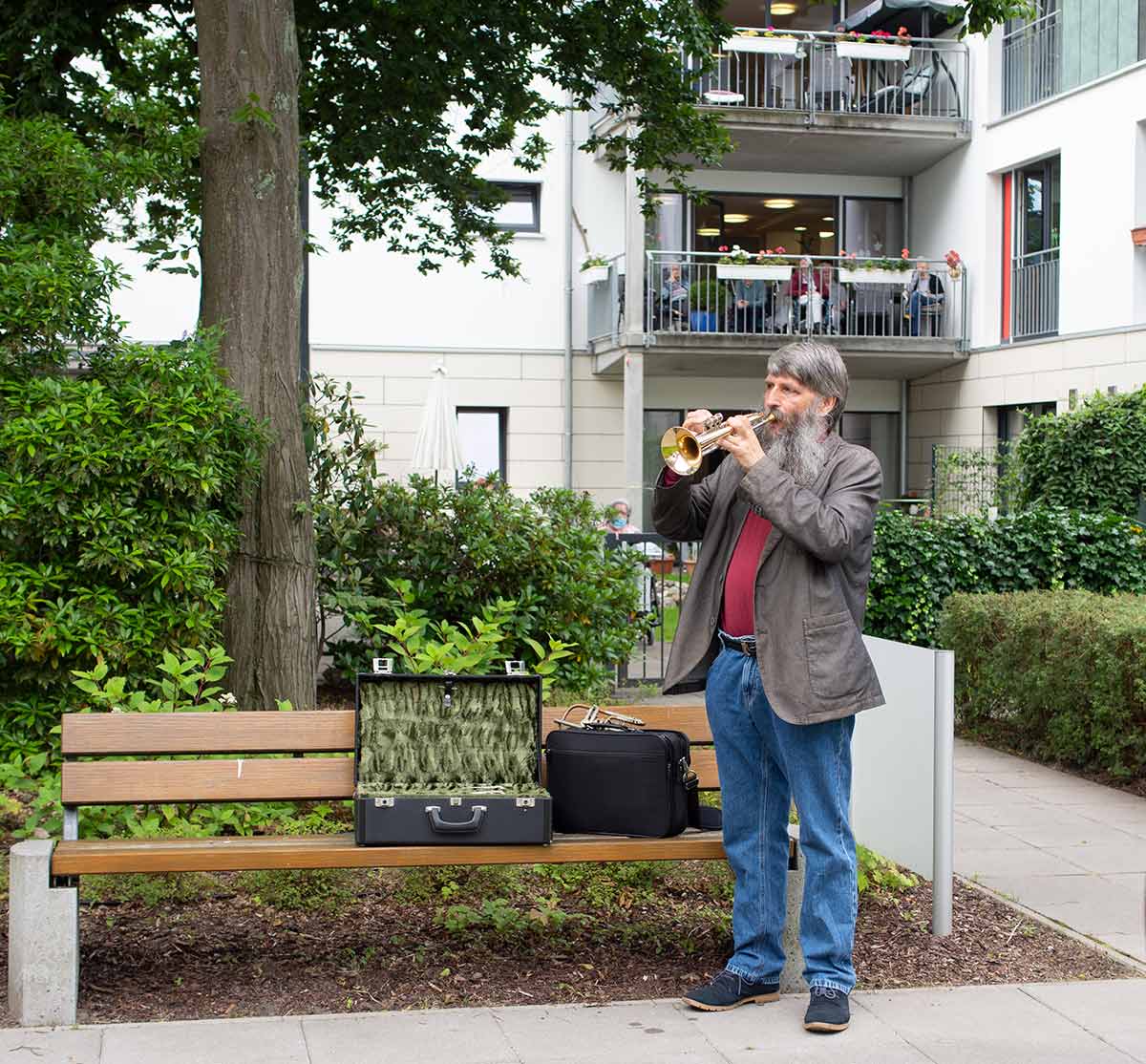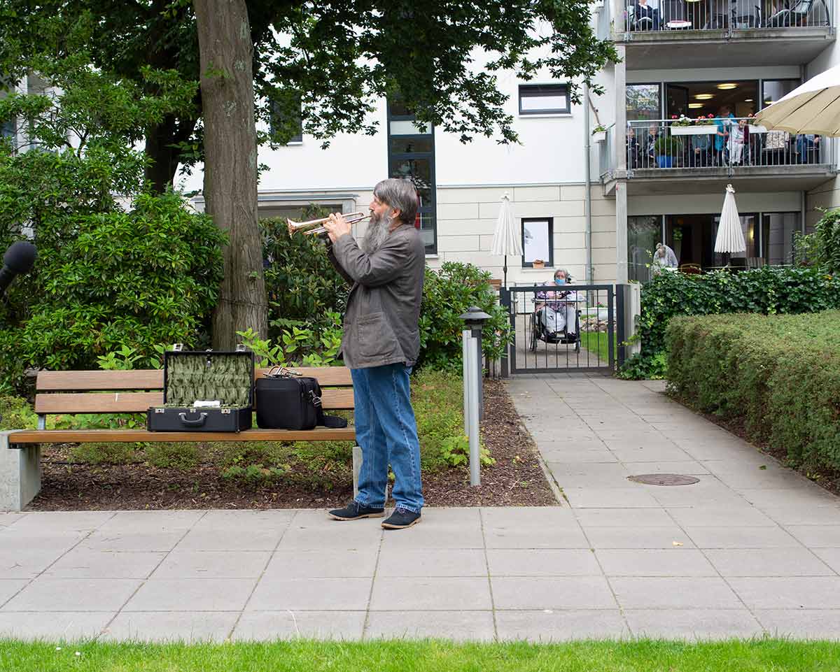 Am Sonntag, 19. Juli, durften wir den wechelnden Solo-Trompeten von Carsten Tillmann Schmidtpott lauschen. Einige Stücke verleiteten zum Mitsingen. Gerahmt wurde die Musik durch kleine Geschichten, die Frau Drews vom Freundeskreis Schillingstift e.V. vortrug. Ein abschließender Blick in den Koffer auf die sehr unterschiedlichen Instrumente - was für ein schöner Auftakt in den Sonntag!