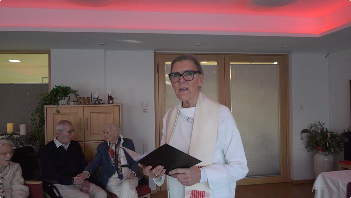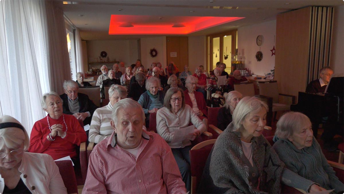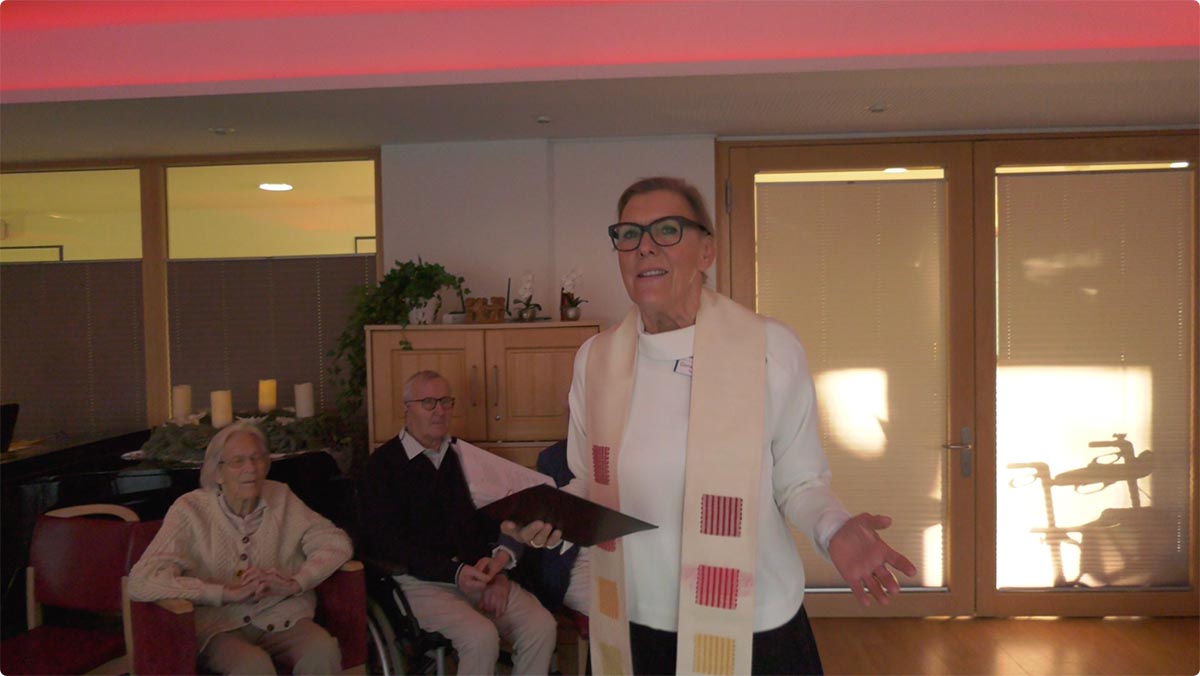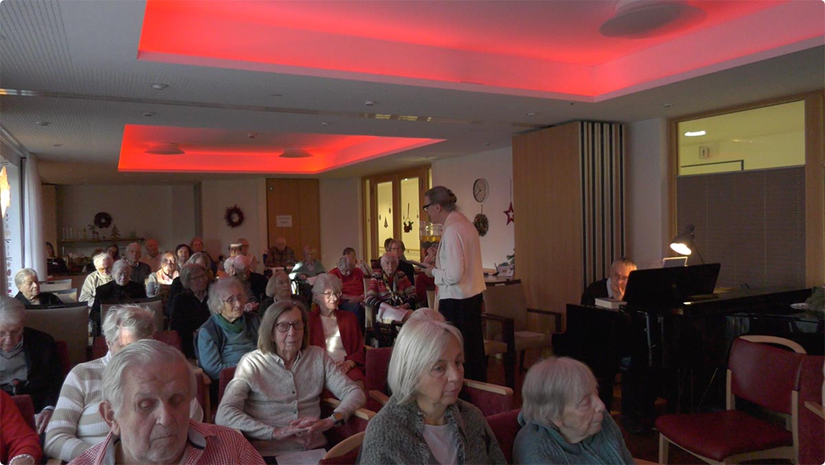 Der Morgen-Gottesdienst am 1. Weihnachtsfeiertag war gleichermaßen gut besucht, sowohl von Bewohnern als auch Angehörigen wie auch haupt- und ehrenamtlichen Mitarbeitern. Aufgrund technischer Probleme konnte der Heiligabend-Gottesdienst nicht auf die Zimmer und Wohnbereiche übertragen werden.